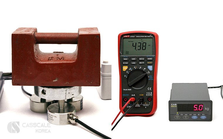 위의 이미지와 같이 세팅된 로드셀 위에 5kg 분동을 올렸을 때에는 약 4.4mA 로 표시되고
