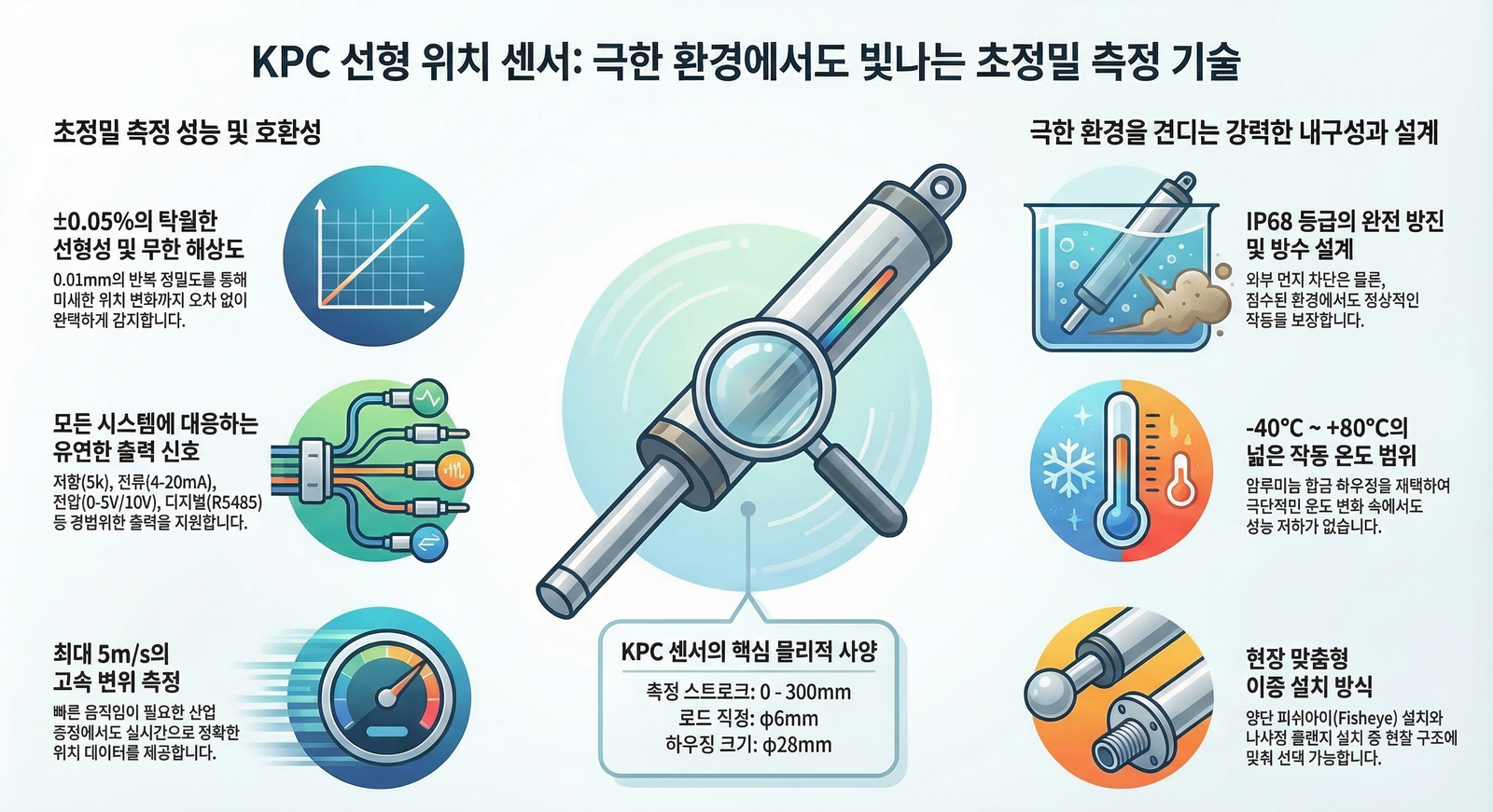 실제 가동 테스트에서 KPC-R-50은 초당 5m 미만의 속도로 움직이는 실린더의 위치를 실시간으로 정확히 잡아냈으며, 무한대에 가까운 해상도를 통해 끊김 없이 매끄러운 위치 데이터를 관제 센터로 전송했습니다.