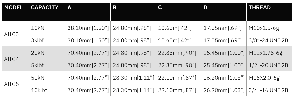 The AILC3, AILC4 & AILC5 are miniature in line load cells that provide precise tensile and compressive force measurements up to 50 kN (or 10 klbf). They use strain gauge technology and are temperature compensated to ensure consistent performance, with a typical rated output of 2 mV/V and non-linearity better than ±0.5%.