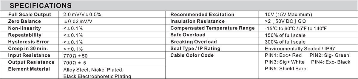 • Full Scale Output: 2.0mV/V ± 0.5%