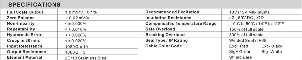 - Full Scale Output: 1.8 mV/V ± 0.1%