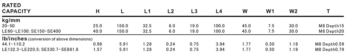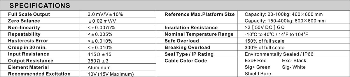 - Rated Capacities: 20kg, 50kg, 60kg, LE60kg, 75kg, 100kg, LE100kg, 150kg, SE150kg, 200kg, SE200kg, 300kg, SE300kg, 400kg, SE400kg, 500kg, SE600kg, 750kg, 1t, 1.5t, 2t