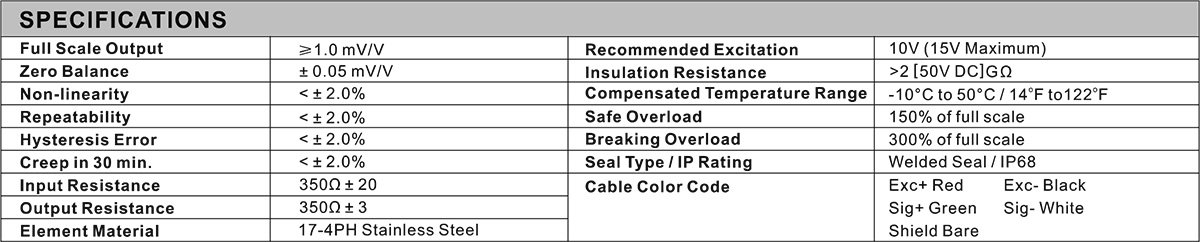 • Breaking Overload: 300% of full scale