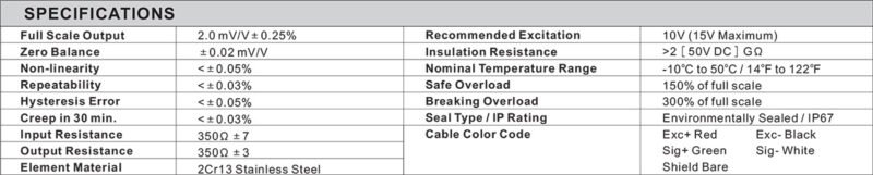 - Full Scale Output: 2.0mV/V ± 0.25%