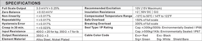 - Rated Capacities: 100lb, 250lb, 500lb, 1Klb, 1.5Klb, 2Klb, 2.5Klb, LE2.5Klb, 4Klb, SE5Klb, 5Klb, 10Klb, 15Klb, 20Klb, 100kg, 200kg, 300kg, 500kg, 750kg, 1t, 1.5t, 2t, 2.5t, 3t, 5t, 10t, 20t