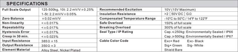 - Full Scale Output: 2.2mV/V ± 0.25% or 2.2mV/V ± 0.05%