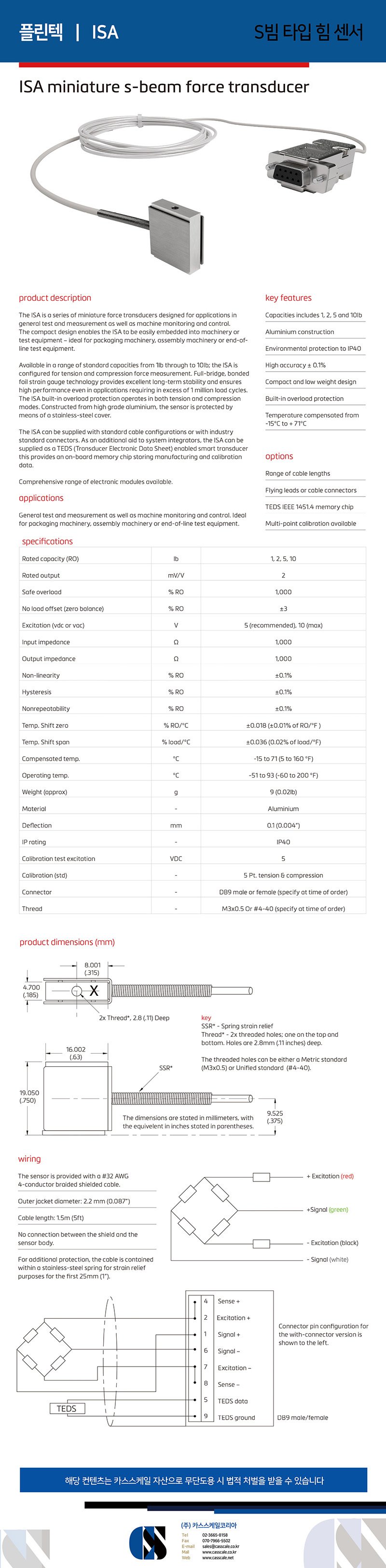 Standard models are available in the range of 500 g (1 lb) to 5 kg (10 lb). The ISA is designed for both tension and compression force measurements. Its full-bridge strain gauge technology ensures excellent long-term stability and delivers high performance in applications requiring over one million load cycles.