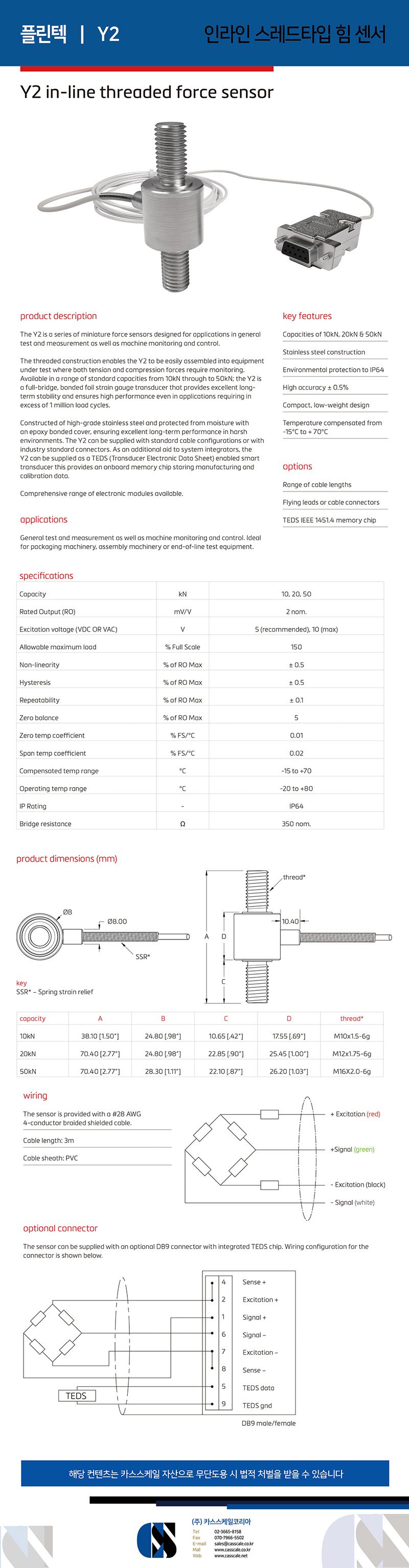 The Y2 can be supplied with standard cable configurations and industry-standard connectors. Additionally, as a smart transducer, Y2 offers an optional TEDS (Transducer Electronic Data Sheet) feature, which provides significant advantages for system integration and management. This feature includes an onboard memory chip that stores manufacturing and calibration data.