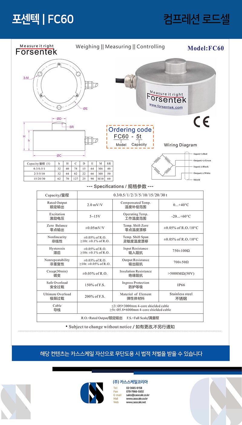 Stainless Steel Compression Load Cell FC60 utilizes metal foil strain gauge technology intended for compression/press force measurement in both static and dynamic cases. Compression Sensor FC60 offers 0-300kg / 0-500kg / 0-1ton / 0-2ton / 0-3 ton / 0-5ton / 0-10ton / 0-15 ton / 0-20ton / 0-30ton ten rated measuring ranges to choose from. You may find compression type force transducer FC60 applicable for injection-molding machines, press machines, load distribution analysis, tooling pressure force control, and so on. Custom made service is available at Forsentek if you cannot find a suitable sensor for your application.