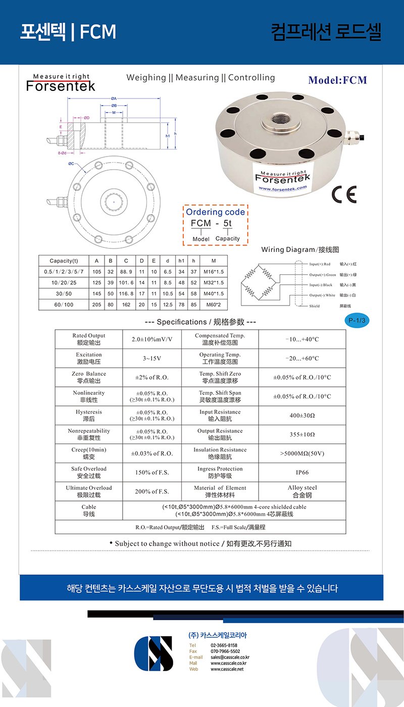 Pancake load cell FCM is made of high stiffness alloy steel based on foil strain gauge technology with mV signal output which is proportional to the applied force.Pancake load cells can be used for both tension and compression force measurements,low profile structure makes it also suitable for in-line force monitoring.