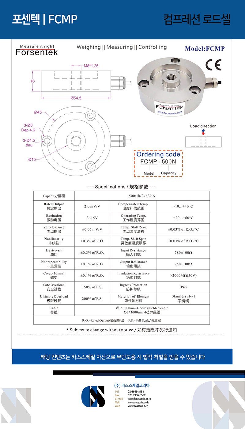 Low profile pancake load cell FCMP is made of stainless steel with 500N / 1kN / 2kN / 3kN four rated capacities intended for tension and compression force measurement. The compact load cell incorporates a M8x1.25 threaded hole running through the center of the transducer which can be used to mount attachments such as load buttons,eye bolts or other adapters for force loading to meet requirements of different applications. Force transducer FCMP is suitable for both static and dynamic force measurement.
