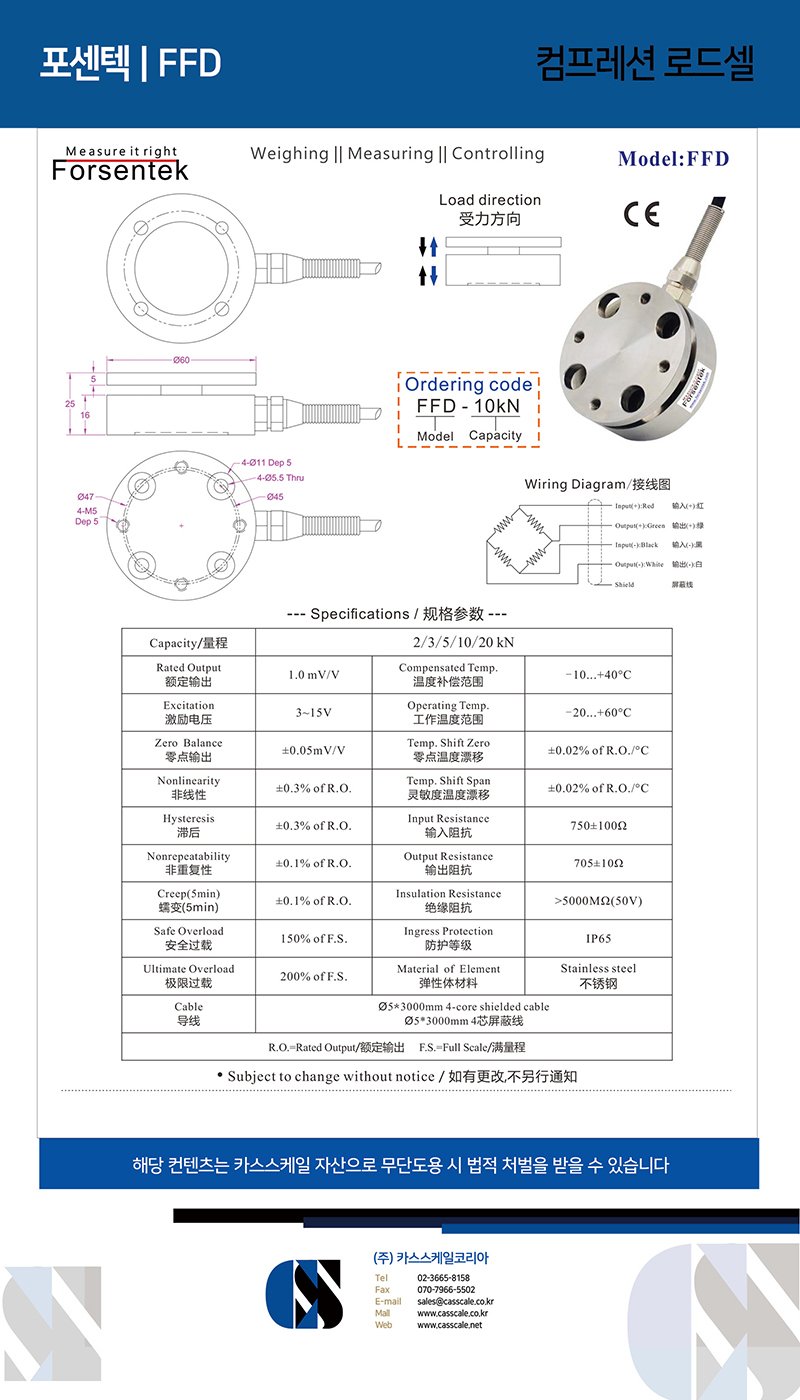 Flange load cell FFD is made of stainless steel utilizing strain gauge technology to deliver maximum 0.2% non-linearity.Press force load cell FFD is intended for both tension and compression force measurement with 2kN / 3kN / 5kN / 10kN / 20kN five different measuring ranges to choose from. Flange to flange configuration makes mounting easy and solid,low profile design with total 25mm height makes FFD applicable for applications where mounting space is limited.In addition to the standard specifications,Forsentek is also capable of and willing to provide custom design service to meet requirements of different applications.