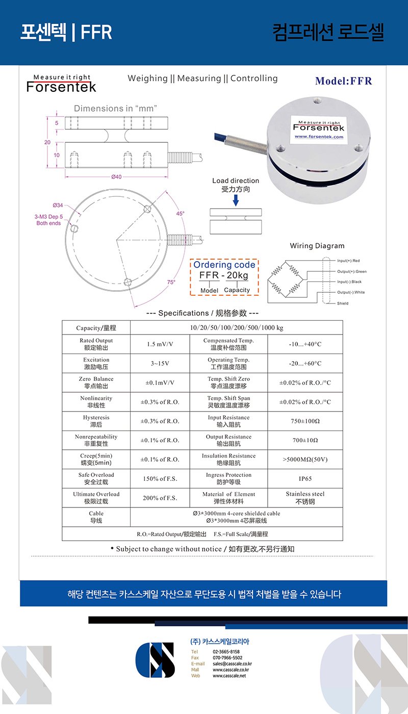 Flange mounted load cell FFR is strain gauge based with full wheatstone bridge configuration delivering mV/V output intended for compression force measurement, flange-to-flange load cell FFR offers the same mounting dimensions with 0-10kg / 0-20kg / 0-50kg / 0-100kg / 0-200kg / 0-500kg / 0-1000kg seven measuring ranges to choose from. You may find flange type force transducer FFR applicable for fixture clamping force measurement, load distribution analysis, sliding thrust measurement, hand press force verification, and so on. Flanged load cell FFR can also be modified or customized as per client’s request.