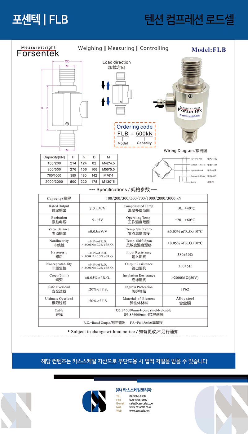 Rod end load cell FLB is made of high stiffness alloy steel based on strain gauge technology intended for both compression and tension force measurement. Inline load cell FLB is featured with threaded rods on both sides for easy mounting, available in 100kN / 200kN / 300kN / 500kN / 700kN / 1000kN / 2000kN / 3000kN eight rated capacities, you may find traction compression sensor FLB applicable for material testing, cylinder thrust measurement, hydraulic actuator testing, laboratory measurements and so on.