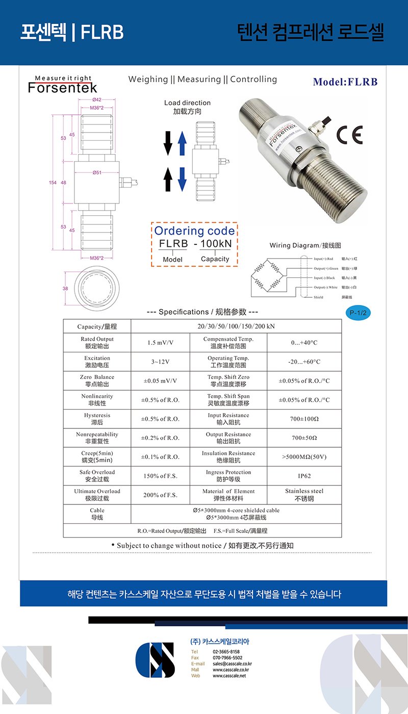 Threaded in line load cell FLRB utilizes strain gauge technology intended for tension and compression force measurement. Rod end force sensor FLRB is made of stainless steel with M36 male threads on both sides for mechanical connection. Force transducer FLRB offers 20kN / 30kN / 50kN / 100kN / 150kN / 200kN six rated capacities to choose from. Model FLRB can also be modified or customized to meet requirements of different applications.