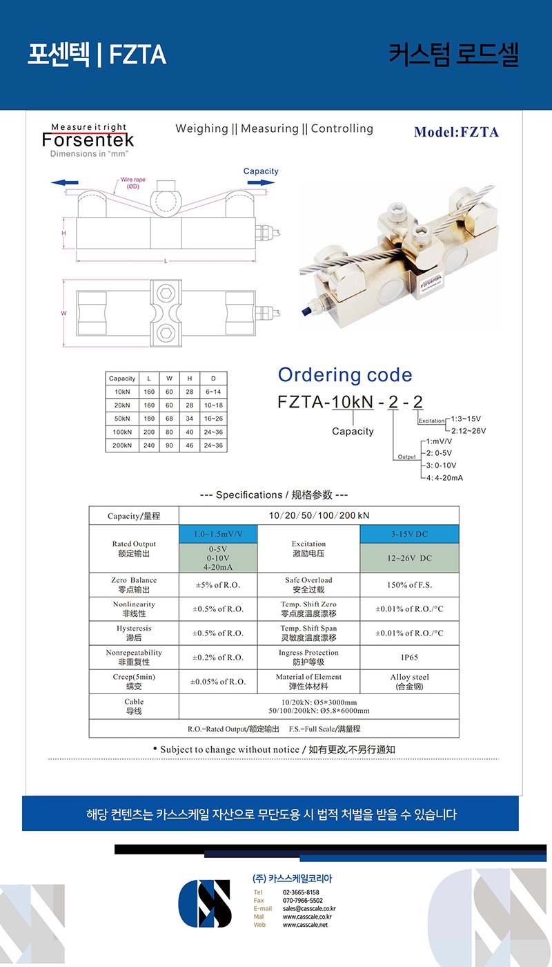 Wire rope load cell FZTA is specially designed to be easily clamped on the fixed end of the steel cable to monitor the rope tension without opening it, this allows the existing safety margin to be maintained. Clamp-on load cell FZTA offers 10kN, 20kN, 50kN, 100kN and 200kN five rated capacities supporting cable diameter from 6mm to 36mm. 0-5V, 0-10V and 4-20mA output is available through built-in amplifier. Rope tension sensor FZTA is widely used for cable tension measurement and provides overload protection for hoisting equipment like cranes and elevators.