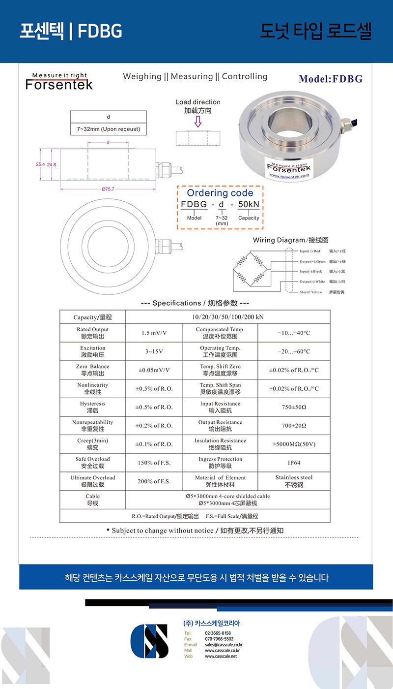 Through hole load cell is also known as donut load cell which is suitable for measurement applications where the load structure needs to pass through the sensor. Washer type load cell FDBG offers 10kN / 20kN / 30kN / 50kN / 100kN / 200kN six rated capacities with customizable center thru hole diameter from 7mm to 32mm specified by clients which makes model FDBG a very flexible option for clamping/tightening force measurement.