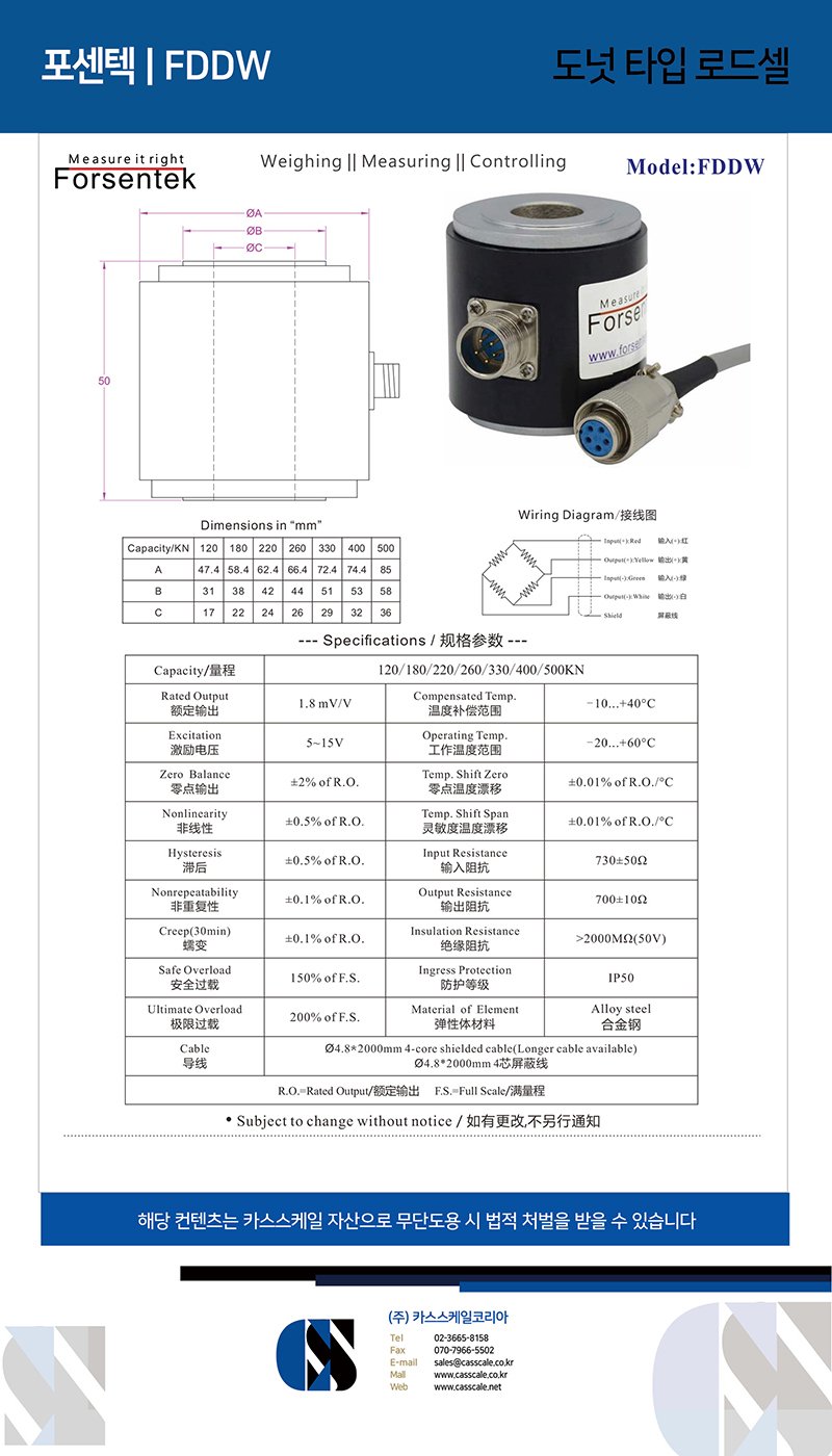Through hole load cell is also known as donut load cell or washer load cell.Annular load cell FDDW is made of alloy steel offering 120kN / 180kN / 220kN / 260kN / 330kN / 400kN / 500kN measuring ranges to choose from.The center thru-hole structure makes it especially suitable for fastening force monitoring.In addition to the standard specifications, parameters like outer diameter, inner diameter, total height and measuring range can also be custom made according to client’s requirements.