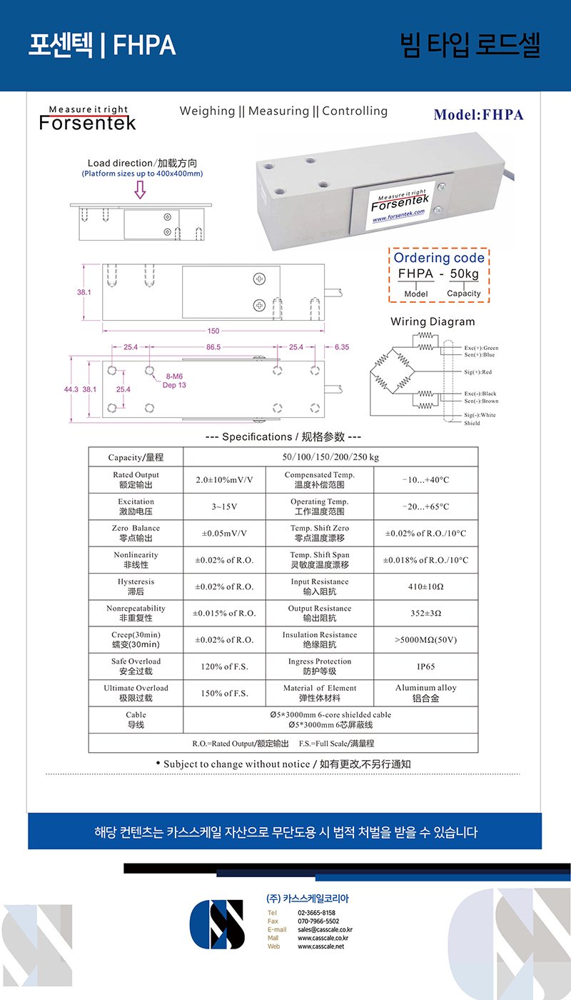 Single point load cell FHPA is made of aluminum with 50kg / 100kg / 150kg / 200kg / 250kg five rated capacities. Anodized coating makes it resistant to environmental conditions and suitable for many industrial weighing applications. A special humidity-resistant protective coating provides IP65 protection and assures long-term stability over the entire compensated temperature range. Off center load cell FHPA is suitable for platform sizes up to 400x400mm and weighs within tolerance regardless of load point due to the off-center load compensation process. The FHPA weight transducer is ideally suited to be used in single-point applications such as bench scales, weighing control systems, filling and packing machines and so on.