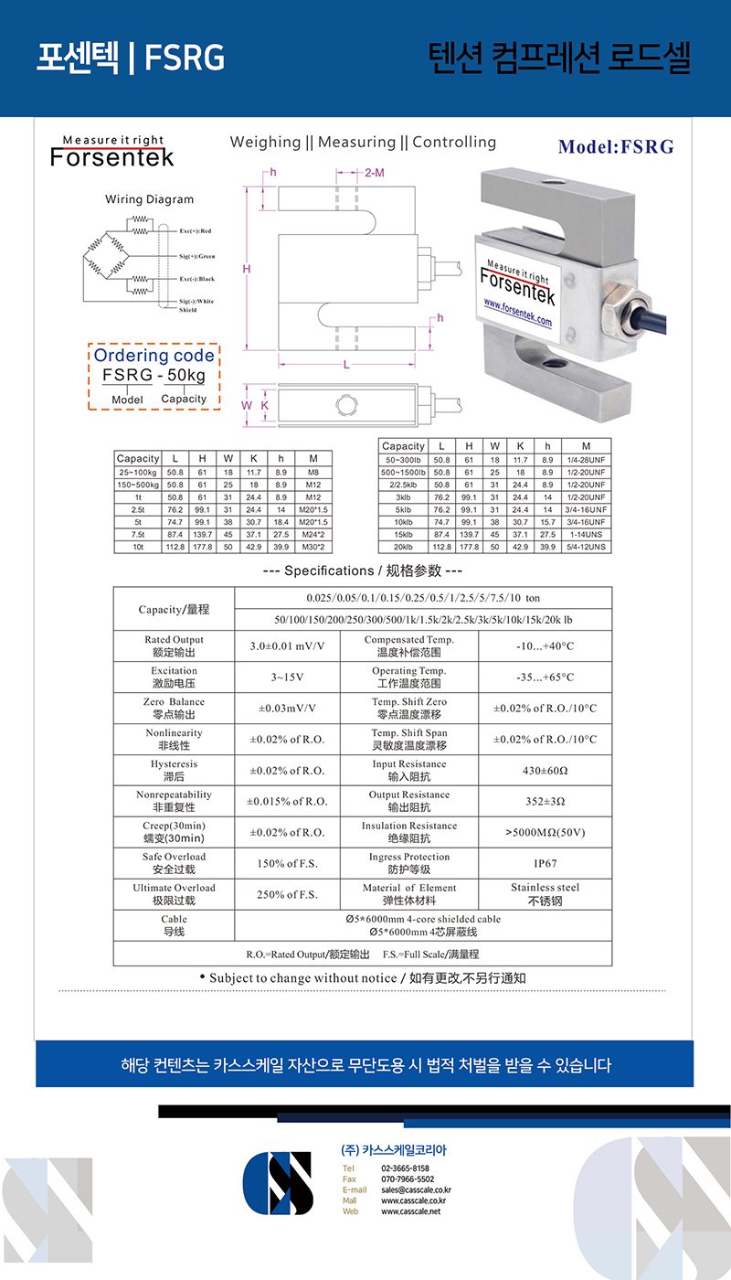 S type load cell FSRG is made of stainless steel based on strain gauge technology with trimmed 3.0mV/V output intended for tension and compression force measurement,it is available in a wide range of capacities from 25kg to 10 ton (50lb to 20klb) with maximum 0.02% non-linearity of the full scale.Universal s-beam load cell FSRG is hermetically sealed to IP67 with both metric and imperial threads available.Model FSRG is applicable for rope and chain strength testing, bagging machines, concrete batching equipment, material testing machines, hanging scales, hoppers and tank weighing applications.You may find FSRG interchangeable with Siemens SIWAREX WL250 ST-S SA,VPG Revere 9363, Artech model SS 20210, ptglobal PT4000, Rice Lake RL20000SS and RL20000ST, VPG Sensortronics 60050 but with lower cost.