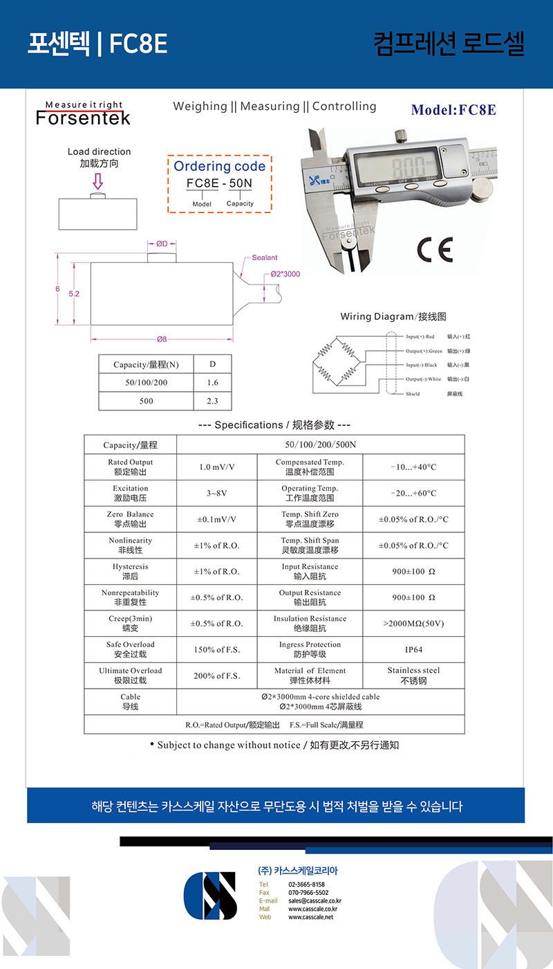 Micro button load cell force sensor FC8E is made of stainless steel based on metal foil strain gauge technology intended for compression force measurement. Subminiature compression force transducer FC8E offers 0-50N / 0-100N / 0-200N / 0-500N four rated measuring ranges to choose from. Smallest compression load cell FC8E is featured with only 8mm outer diameter and 6mm total height which makes it extremely suitable for force measurement applications with limited mounting space.