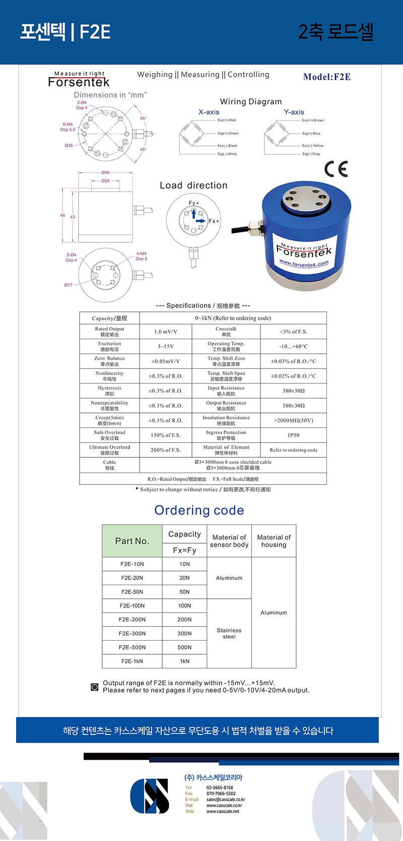 2-axis load cell F2E offers 10N / 20N / 50N / 100N / 200N / 300N / 500N / 1kN eight measuring ranges for two-dimensional force measurement in Fx/Fy directions.Each axis consists of a full wheatstone bridge to deliver mV/V output proportional to the force applied, both axes are able to measurement tension and compression load.Bi-axial force sensor F2E can be modified or customized to meet requirements of different applications.