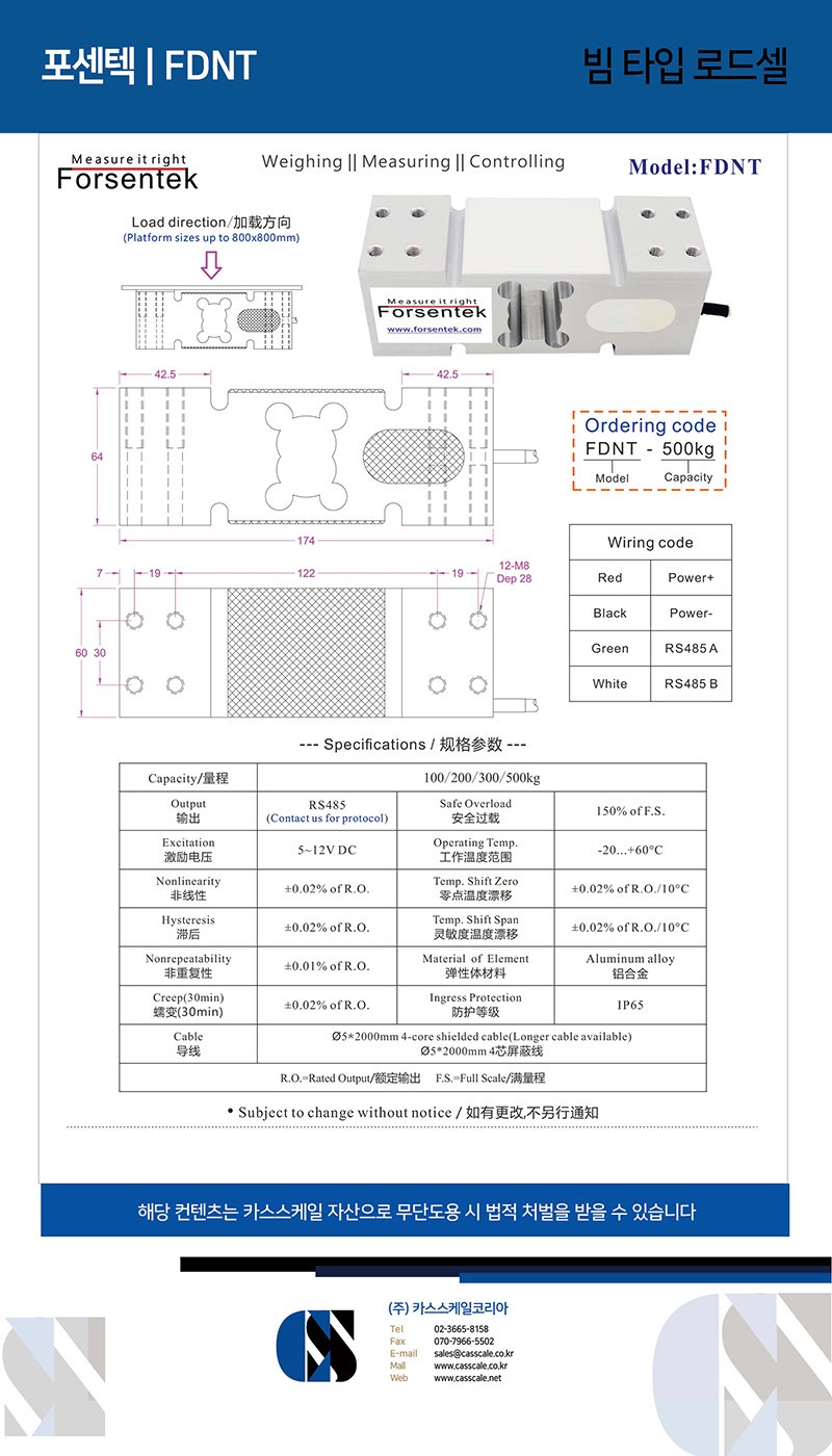 Digital load cell with RS485 output (Model FDNT) utilizes a microprocessor inside of the sensor to convert the analog signal from the wheatstone bridge to digital signal, which is less susceptible to interference from radio frequencies, electromagnetics, temperature,etc., this makes digital load cells more stable and accurate compared to analog load cells. Load transducer FDNT supports RS485 Modbus RTU protocol with 0-100kg / 0-200kg / 0-300kg / 0-500kg four rated measuring ranges to choose from, off-center load compensated for platform sizes up to 800x800mm. Weight sensor FDNT is constructed from aluminium and environmentally sealed with potting compound to ensure durability. Typical applications of model FDNT are for example platform scales, automated weighing stations, food packaging machines, Intelligent warehouse weighing system, waste management scales and so on.