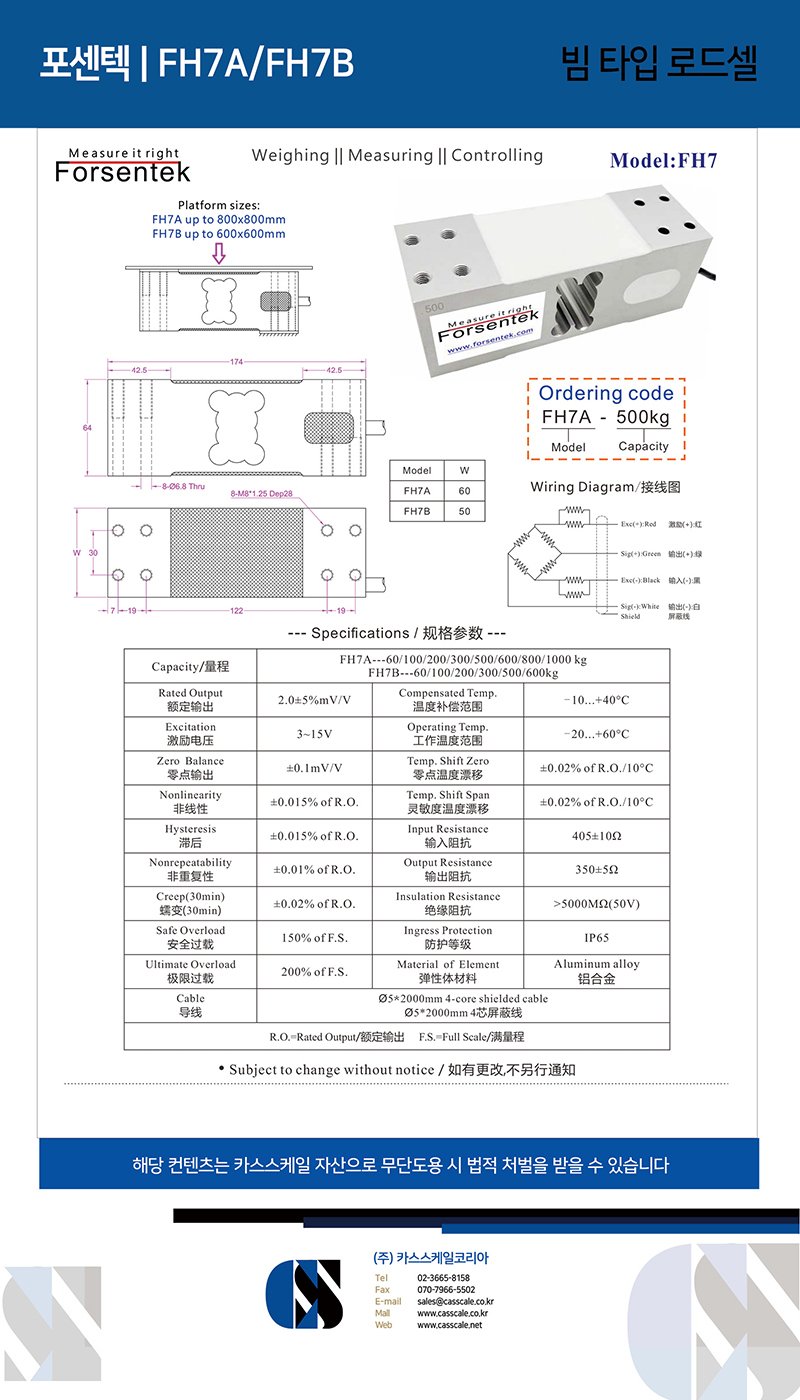 Single Point Load Cell FH7A/FH7B is strain gauge based with 2.0mV/V rated output, high accuracy with 0.015% non-linearity error of the full scale. It is off-center load compensated for up to 800x800mm platform which makes weight sensor FH7A/FH7B ideal for single-cell large-platform scales. Temperature compensation process guarantees stable performance over a wide of working temperature. Environmentally sealed with potting compound to ensure durability. Weighing transducer FH7A offers 1000kg / 800kg / 600kg / 500kg / 300kg / 200kg / 100kg / 60kg eight rated capacities to choose from, you may find load cell sensor FH7A interchangeable with Sentronik 7342, anyload 108CA, VPG Tedea-Huntleigh 1263, Coti Global CG-50-2, Transcell FAV, Zemic L6G, Optima OP-305, ptglobal PTASP6-G. Typical applications of weight sensor FH7A are for example platform scales, automated weighing stations, food packaging machines, intelligent warehouse weighing system and so on.