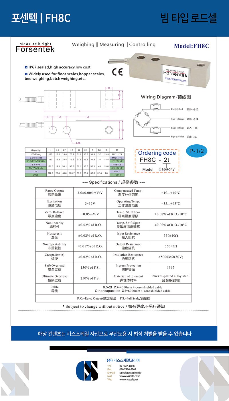 Shear beam load cell FH8C utilizes strain gauge technology to deliver 3.0mV/V rated output with wide measuring ranges from 100kg up to 10 ton to choose from, temperature compensated with maximum 0.02% non-linearity. High accuracy, competitive price, IP67 hermetically sealed, you may find loadcell FH8C applicable for platform scales, batch weighing, hopper scales, garbage weighing system, medical bed weighing,etc..
