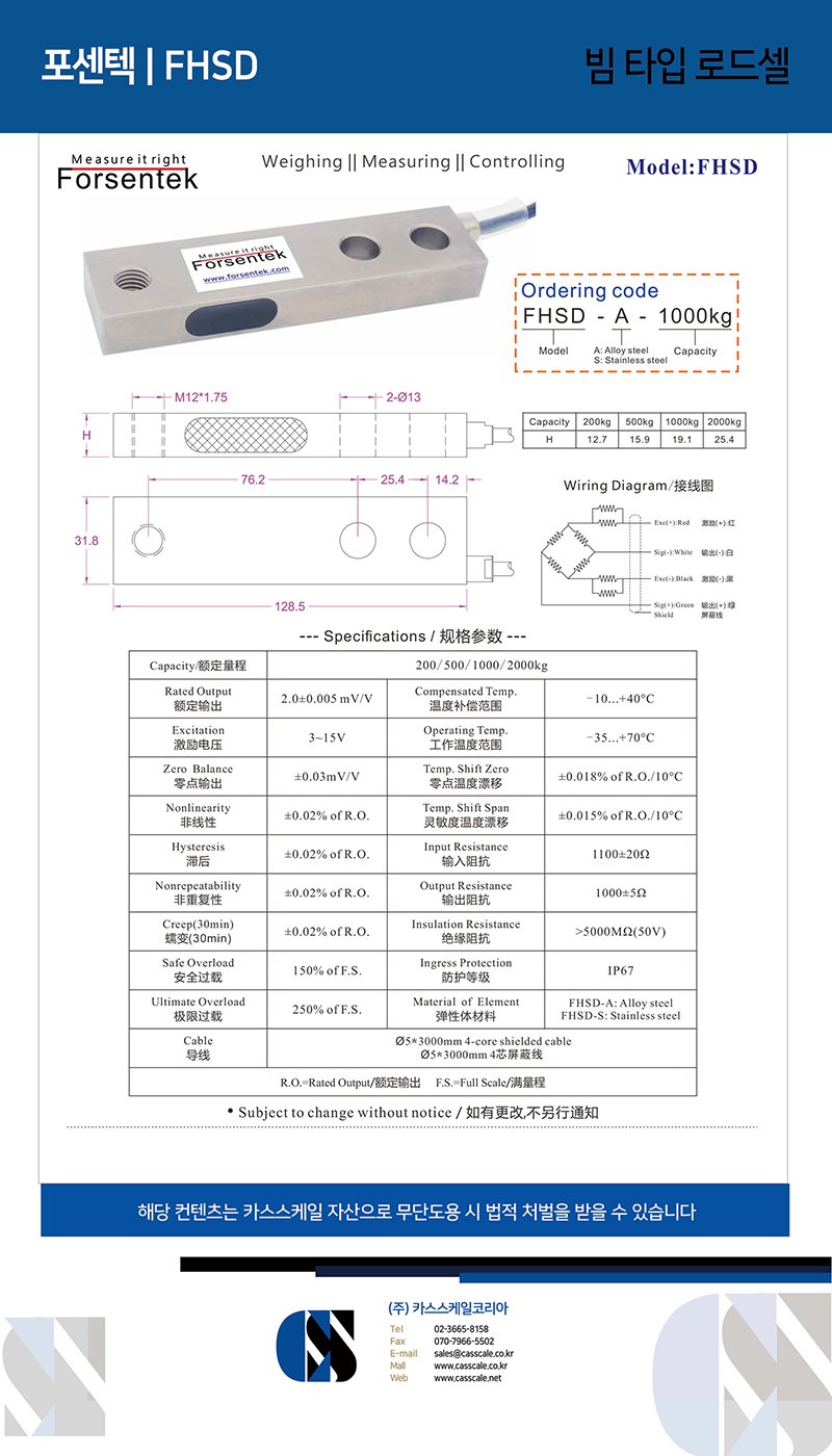 Single ended shear beam load cell FHSD offers alloy steel and stainless steel two options with 200kg / 500kg / 1000kg / 2000kg four rated capacities to choose from, IP67 environmentally sealed through humidity-resistant protective coating which assures long-term stability and durability over the entire compensated temperature range in most application scenarios. High accuracy, easy to install, low profile shear beam loadcell FHSD offers a high quality weighing solution for platform weighing machines, pallet scales, tank and vessel weighing systems, conveyor scales and patient weighing systems such as intensive care beds and wheelchair scales and so on.