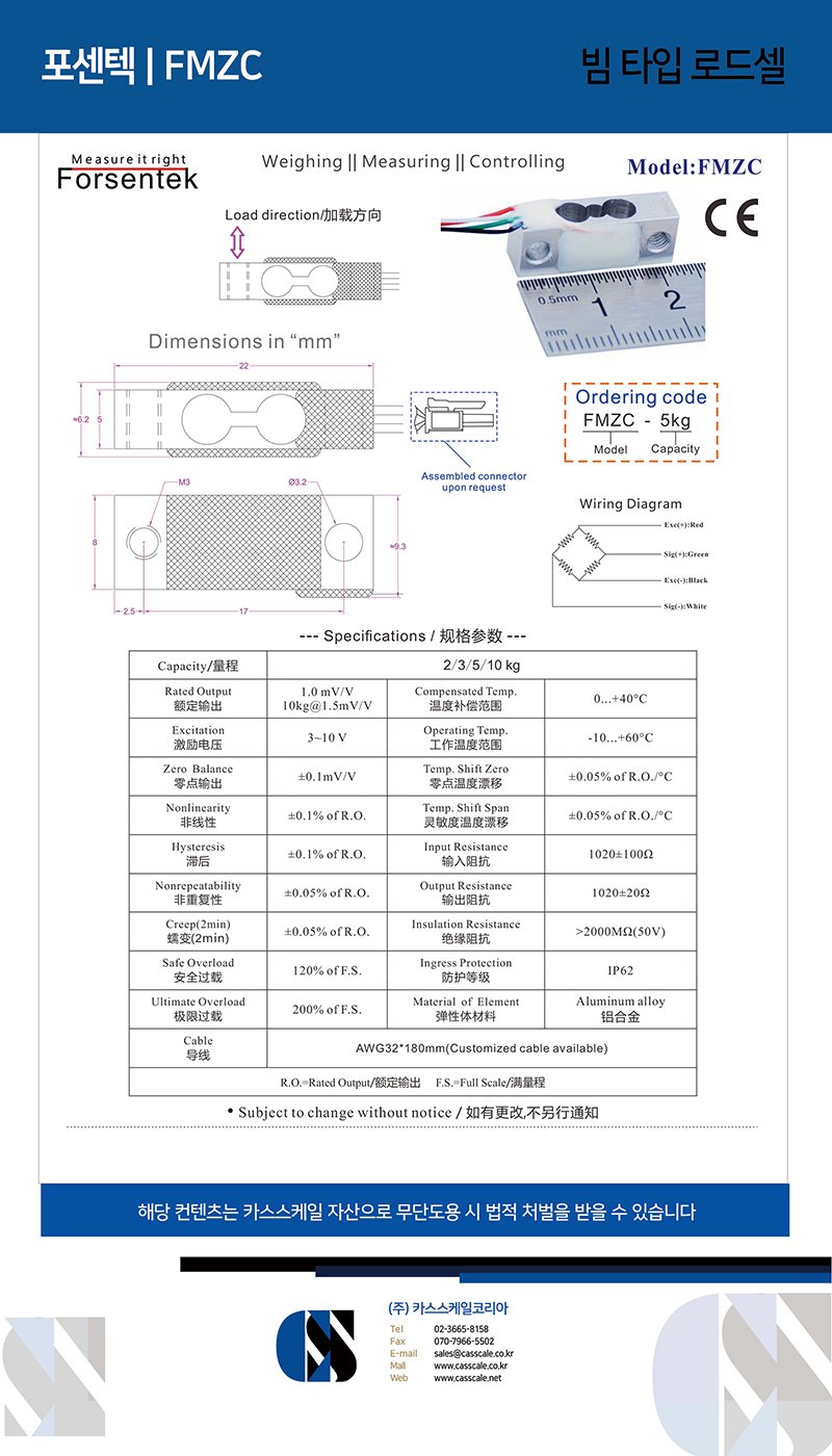 Micro light weight load sensor FMZC is stain gauge based and delivers 1.0mV/V output from the full wheatstone bridge. Small size weight sensor FMZC offers 0-2kg / 0-3kg / 0-5kg / 0-10kg four measuring ranges with maximum 0.1% non-linearity to choose from. Micro weight transducer FMZC uses 1000 ohms high resistance strain gauges, which is more energy-efficient compared to commonly used 350 ohms gauges. The compact size(L*W*H=22*8*5mm) and aluminum material makes FMZC weighs only about 2.2 grams which makes it suitable for weight measuring applications where total mass matters and mounting space is limited. Miniature Lightweight Load Cell FMZC offers a perfect mixture of small size,high accuracy and low cost.In addition to the standard size and capacities, Forsentek is also capable of and willing to provide customized load cells according to client’s specific requirements.