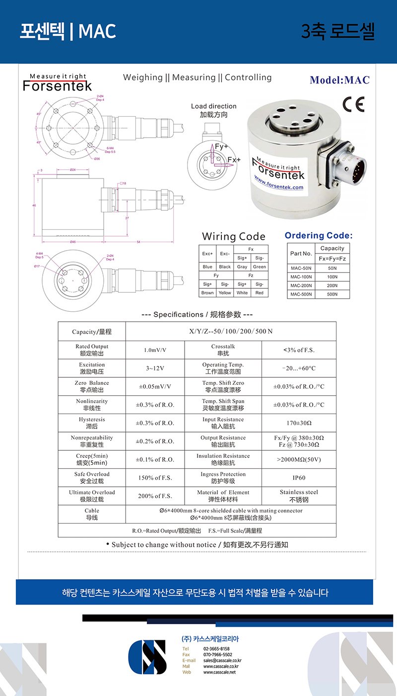 Multi axis load cell MAC is designed to measure forces simultaneously in 3 mutually perpendicular axes Fx/Fy/Fz,multi-axis force sensor MAC utilizes independent wheatstone full bridge for each axis which provides mV/V output proportional to the applied force.Model MAC offers 50N / 100N / 200N / 500N four measuring ranges to choose from,all three axes support both tension and compression force measurement.Stainless steel construction,flange to flange mounting and compact design makes MAC suitable for applications such as force exertion control in robotics,industrial test benches,grinding force control,actuator operating force measurement,etc..