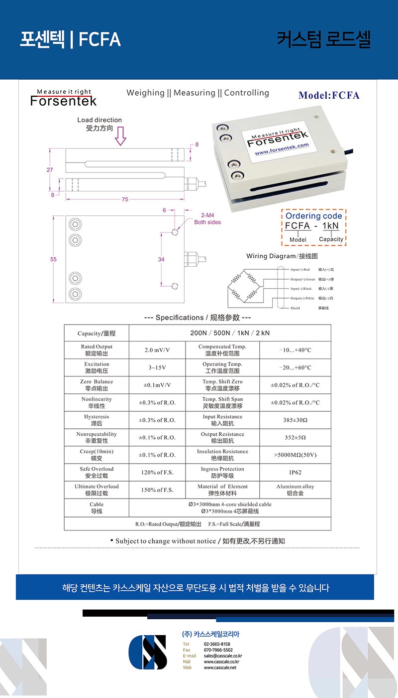 Pedal force transducer FCFA is made of aluminum based on strain gauge technology intended for automotive pedal force testing during acceleration and deceleration. Brake load cell FCFA offers 200N / 500N / 1kN / 2kN four rated capacities which enables automotive manufacturers to verify the safety and reliability of their braking mechanics. Pedal force load cell FCFA can also be modified or customized to meet different testing needs.