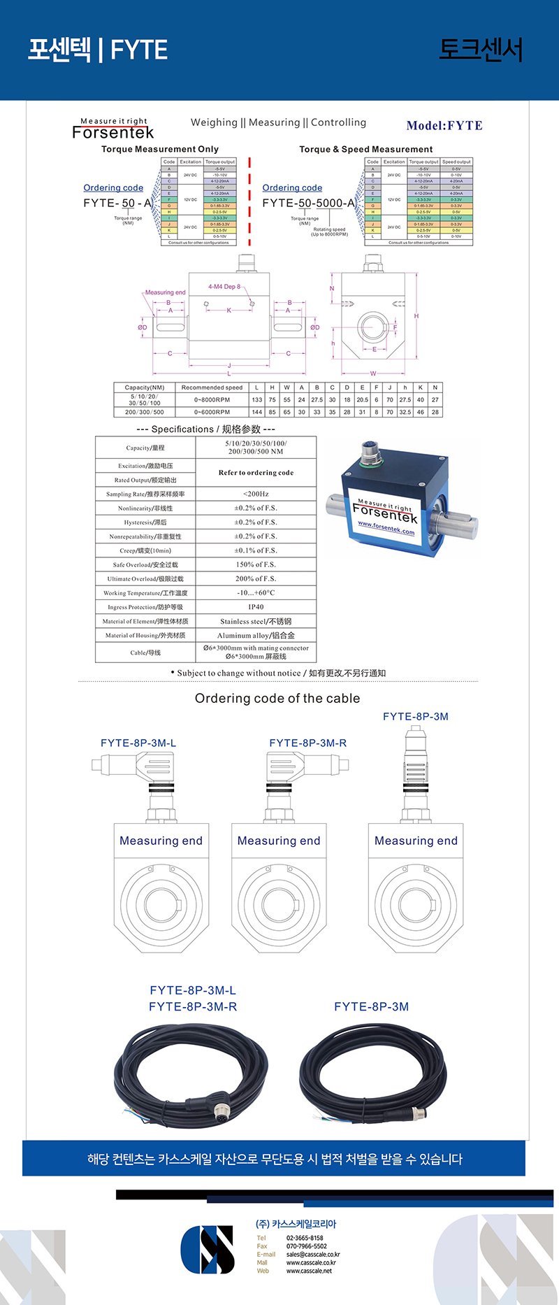 Non-contact shaft-to-shaft rotary torque sensor FYTE is produced based on contactless rotary transformer technology, there is no friction between rotating shaft and signal collect device which makes it much more durable compared to slip-ring type rotary torque sensors.Model FYTE offers 5NM / 10NM / 20NM / 30NM / 50NM / 100NM / 200NM / 300NM / 500NM nine rated capacities to choose from.Integrated with speed encoder for speed measurement up to 8000RPM,built-in circuit board delivers ±5V,±10V or 4-20mA output for easy data processing.Keyed shafts located on both sides can be easily connected to motor and load through couplings.You may find transducer FYTE applicable for motor test benches, agitator torque control, screw locking torque monitoring, torque measurement of engines, pumps, gearboxes and rotating shafts,etc..