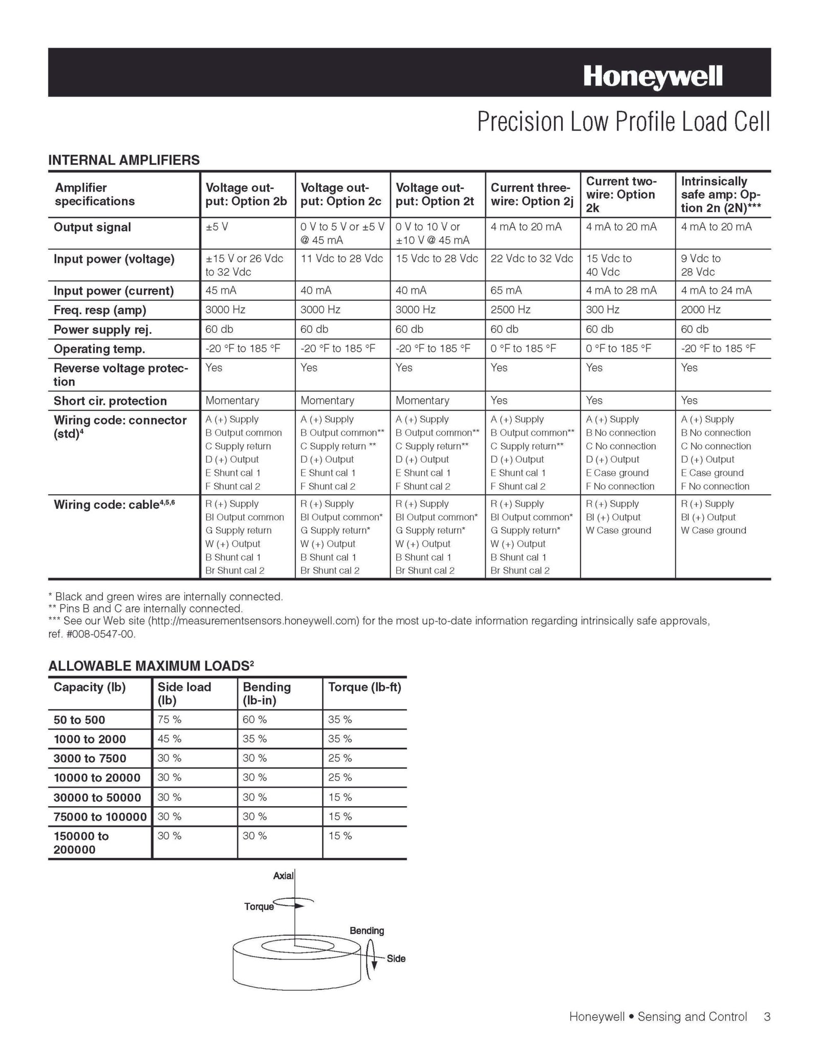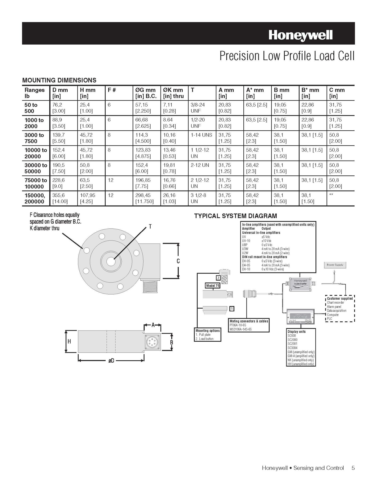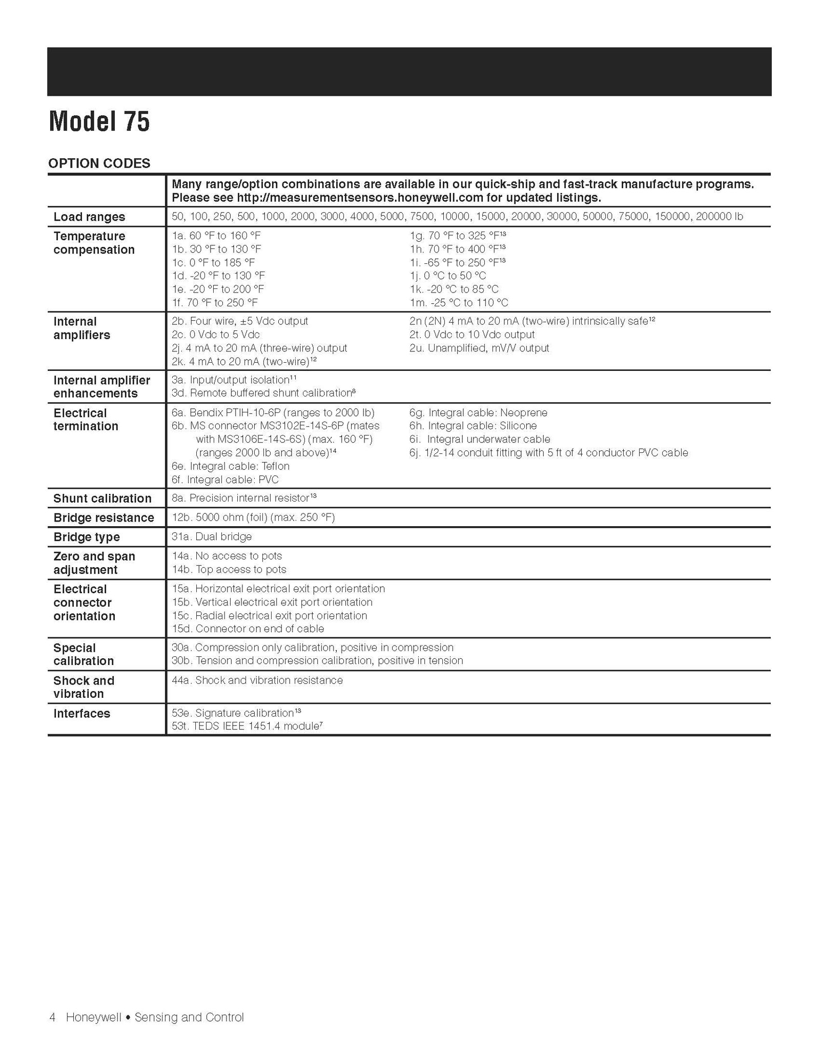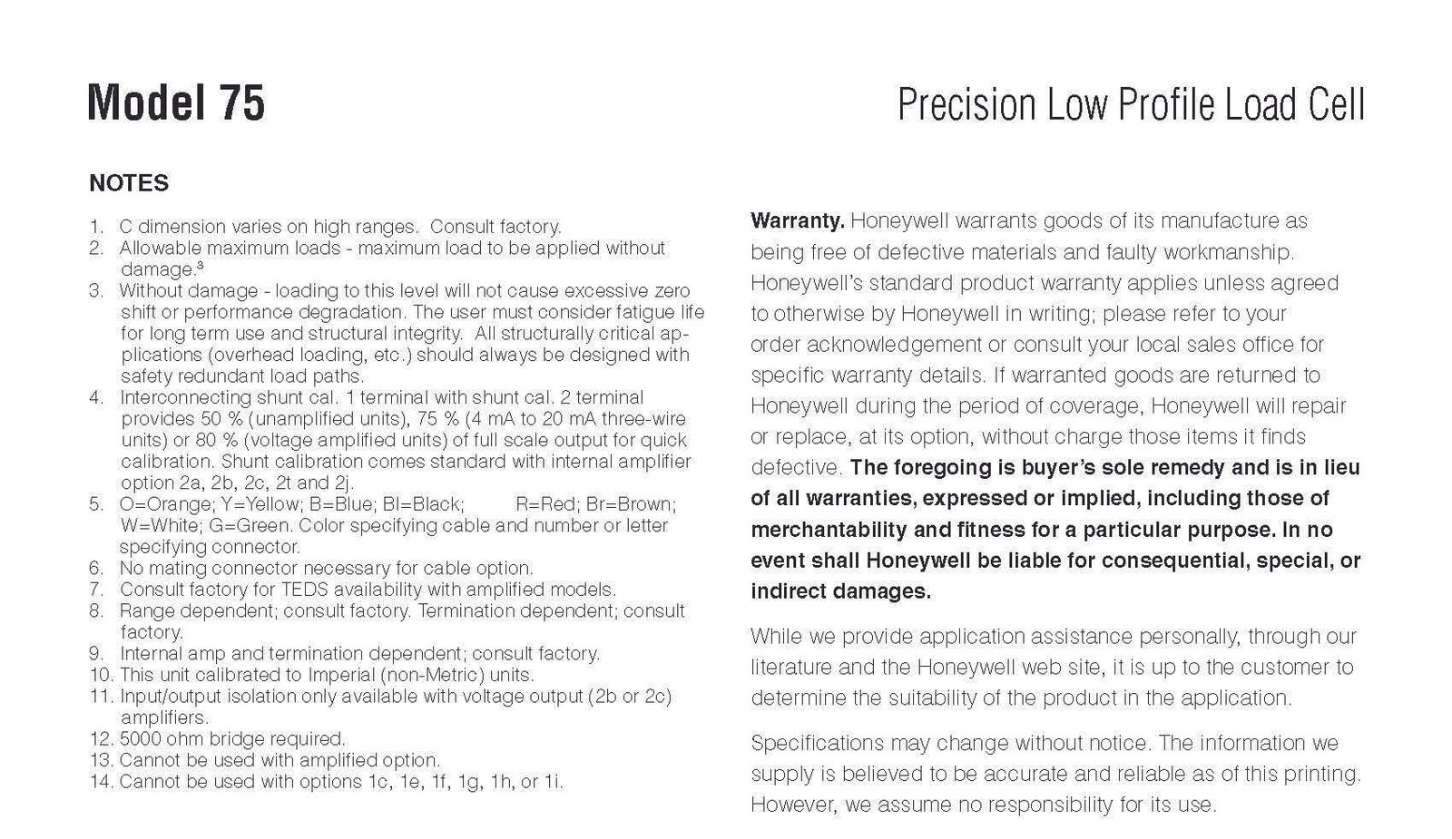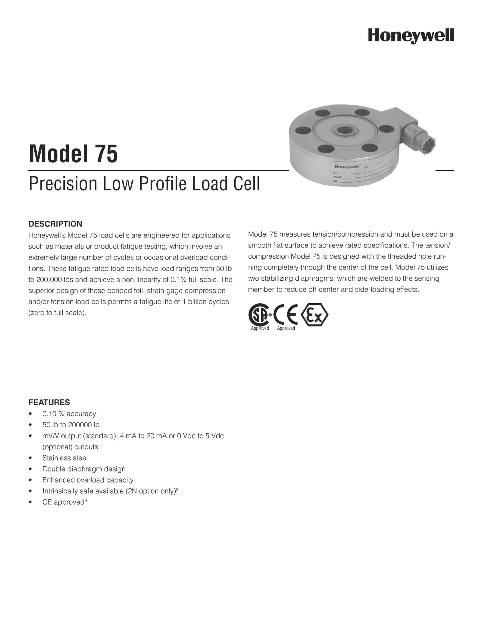 Honeywell’s Model 75 load cells are engineered for applications such as materials or product fatigue testing, which involve an extremely large number of cycles or occasional overload conditions. These fatigue rated load cells have load ranges from 50 lb to 200,000 lbs and achieve a non-linearity of 0.1% full scale. The superior design of these bonded foil, strain gage compression and/or tension load cells permits a fatigue life of 1 billion cycles (zero to full scale).