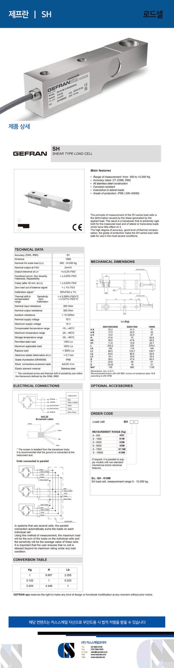 • Measurement range: 500–10,000 kg • Accuracy class: D1 (OIML R60) • Power Supply: 10Vdc ~ 15Vdc • 2mV/V Output • 보호등급: IP66 |