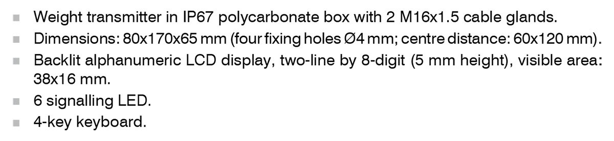 Weight transmitter into IP67 case with backlit LCD display, 38×16 mm, two-line by eightdigit (5 mm height). Four-key keypad for the system calibration. Six indicator LED. 2 M16x1.5 cable glands. Dimensions: 170 x 80 x 65 mm (centre distance 120×60 mm).