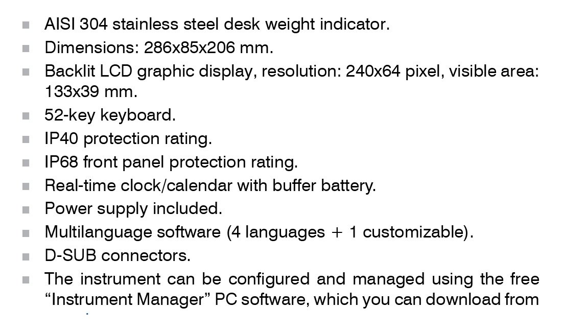 • Vehicle weighing: Double weighing (entry and exit), single weighing (entry or exit), double/single weighing with trailer, mutliple weighing (weighing of multi-compartment trucks). Database with 500 vehicles (license plates, predetermined tare), products, customers and operators. Barcode reader management with printing and call-out of the open weighing ID. Up to 10000 weighings that can be saved in alibi memory. Traffic light management via relay outputs.