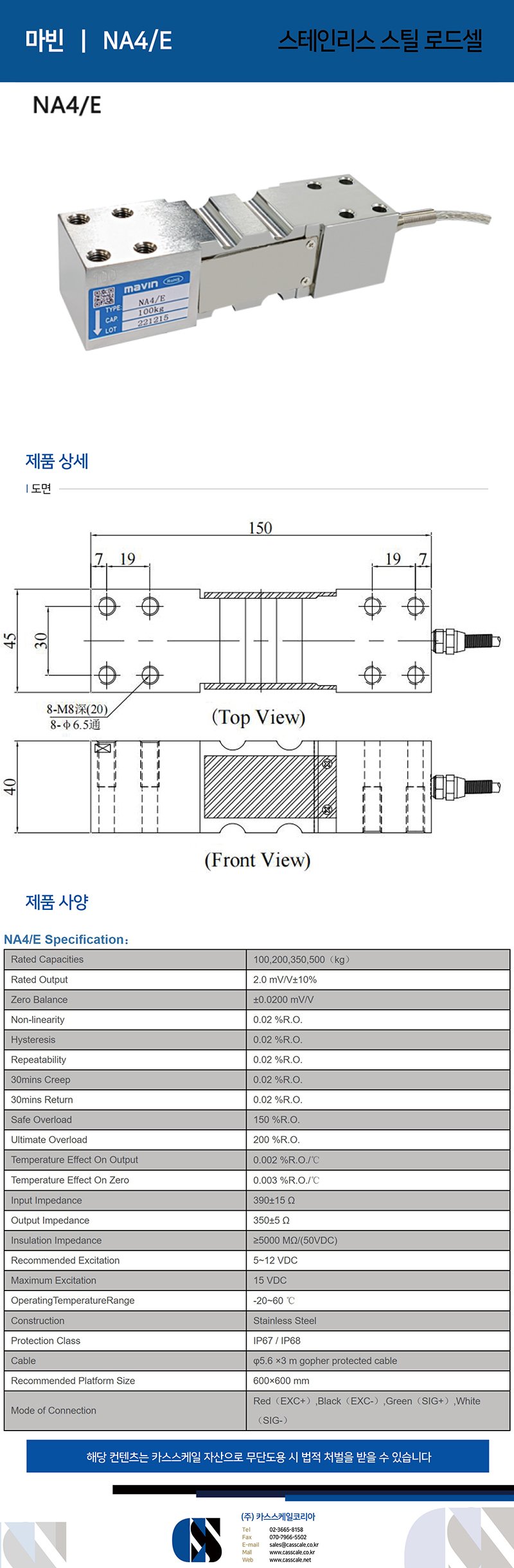 The NA4/E is made with stainless steel construction and high protection class. Stainless steel sensor is effective resistance to corrosive substances. The stainless steel weighing load cell is suitable for retail scales, bench scales, industrial weighing systems. Particularly robust for long-term use in harsh industrial environment.