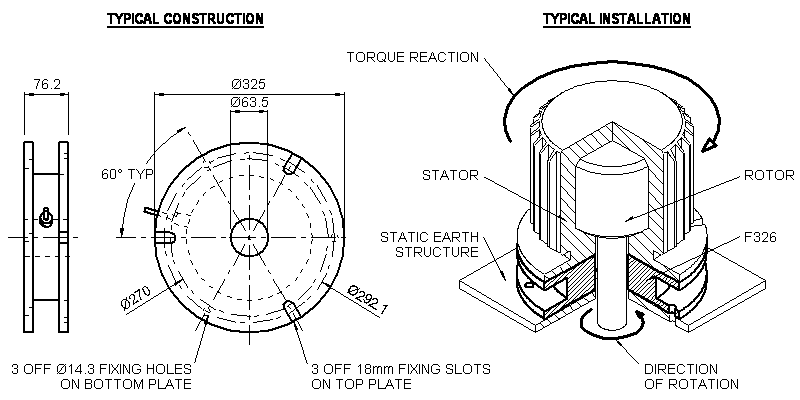 The motor shaft passes through the centre of the F326, the resultant torque reaction on the motor stator is equal and opposite to the shaft torque. Torque is transmitted from the motor stator through the F326 transducer to the earth structure or chassis.