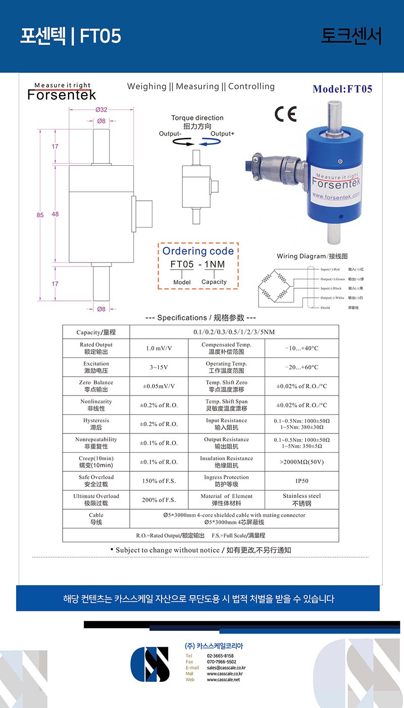Miniature shaft to shaft in-line reaction type torque sensor FT05 utilizes metal foil strain gauges which are bonded on a special machined stainless steel body to deliver a maximum 0.2% non-linearity of the full capacity. Micro Torque Sensor FT05 offers 0.1Nm / 0.2Nm / 0.3N*m / 0.5Nm / 1N*m / 2Nm / 3N-m / 5Nm eight rated measuring ranges for torque measurement in both clockwise and counterclockwise direction. Each sensor includes a 3-meter-long shielded cable with mating connector and an in-house calibration certificate to guarantee the sensor performance. Reaction Torque Sensor FT05 adopts shaft-to-shaft configuration which can be connected to drive devices through couplings, the shaft size can be modified or customized to meet mounting requirements of different applications.