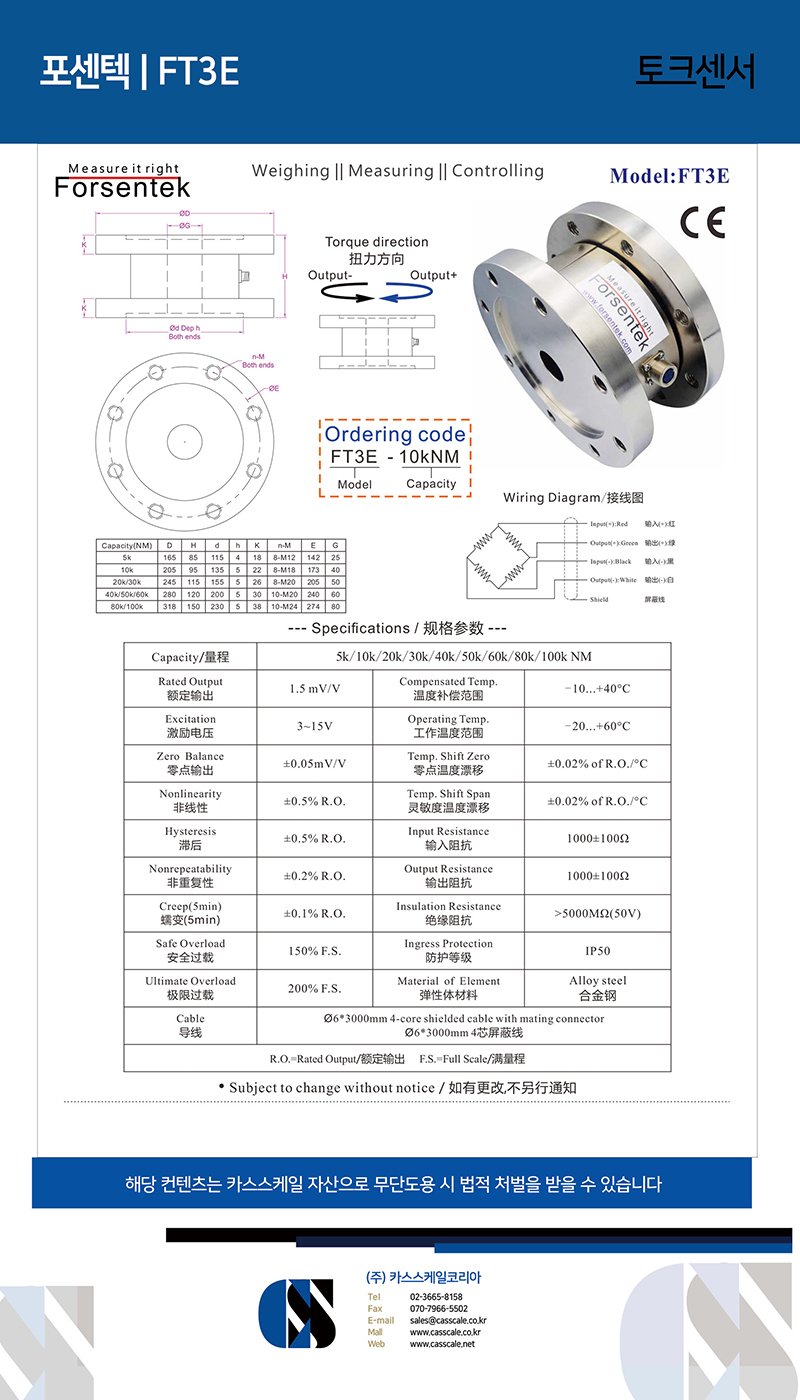 High capacity flange type through hole torque transducer FT3E is a reaction type torque measuring unit intended for non-rotating torque measurement in both clockwise and anticlockwise direction.FT3E series deliver a maximum 0.5% non-linearity of the full scale over a wide measuring range from 5000Nm to 100kNm. Torque load cell FT3E is designed with end flanges for bolting between shafts, axes or mounting plates where a direct drive is required. The center thru hole can be used to pass through a rotating shaft,which makes measuring rotating torque possible under proper configuration. You may find torque transducer FT3E suitable for applications such as actuator torque examination, screw driver calibration, test bench applications, material fatigue testing and so on.