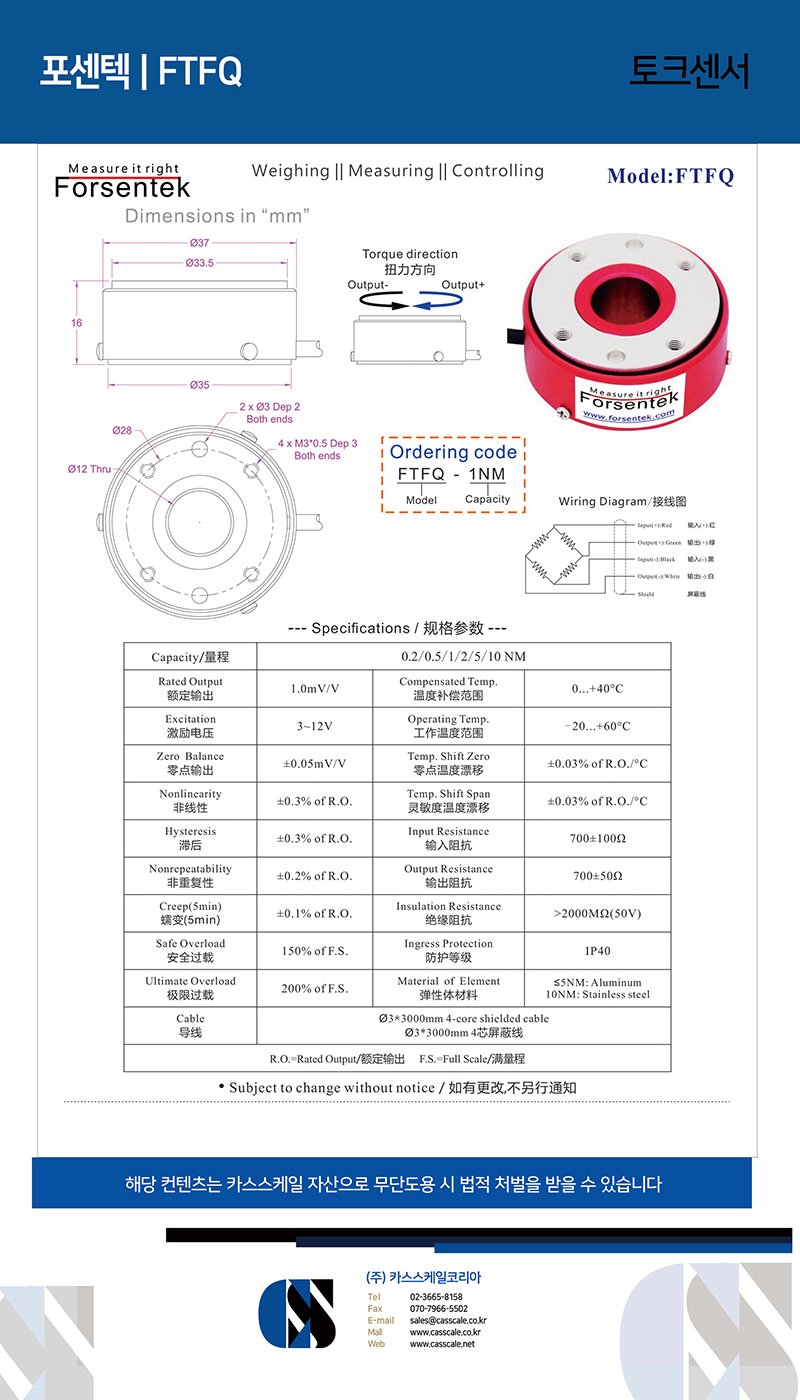 Micro torque sensor FTFQ features a flange-to-flange design with a 12mm diameter center through hole. Reaction torque meter FTFQ offers 0.2N*m / 0.5N*m / 1N*m / 2N-m / 5Nm / 10Nm six rated capacities intended for torque measurement in both clockwise and anticlockwise direction. The compact size makes model FTFQ an excellent choice for applications with limited mounting space. Static torque transducer FTFQ can be modified or customized upon request.