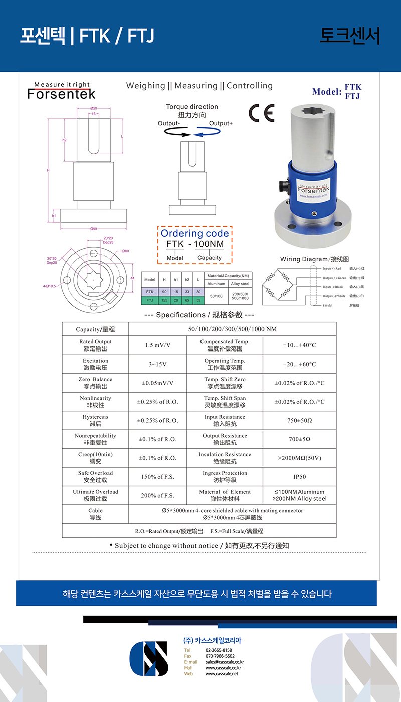 Static torque transducer FTJ/FTK is made from either alloy steel or aluminum depending on the torque range, both models offer 50N-m / 100N-m / 200N-m / 300N-m / 500N-m / 1000N-m six rated capacities intended for reaction torque measurement in both clockwise and anti-clockwise direction. Reaction torque meter FTJ/FTK is normally used with the flange side fixed as the stationary part while the other side loaded by torque wrenches or other torque applying devices. Custom made service is available for other specifications and configurations.