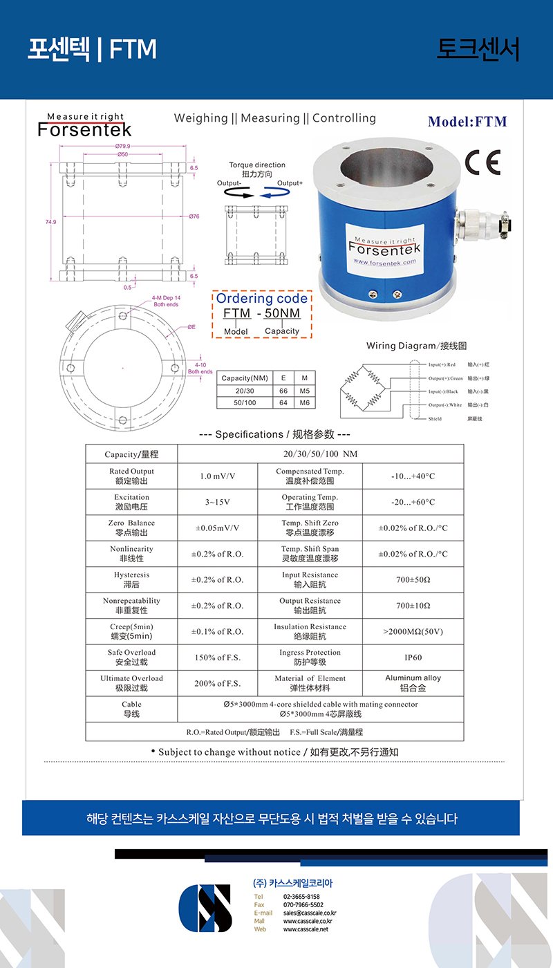 Hollow flange reaction torque transducer FTM features a large thru-hole located in the center through which mating fixtures,electrical lines or rotating shafts can pass.Thru-hole torque sensor FTM measures torque in both clockwise and counterclockwise direction with mV/V output from the wheatstone bridge,model FTM can be modified or customized to meet requirements of different applications.
