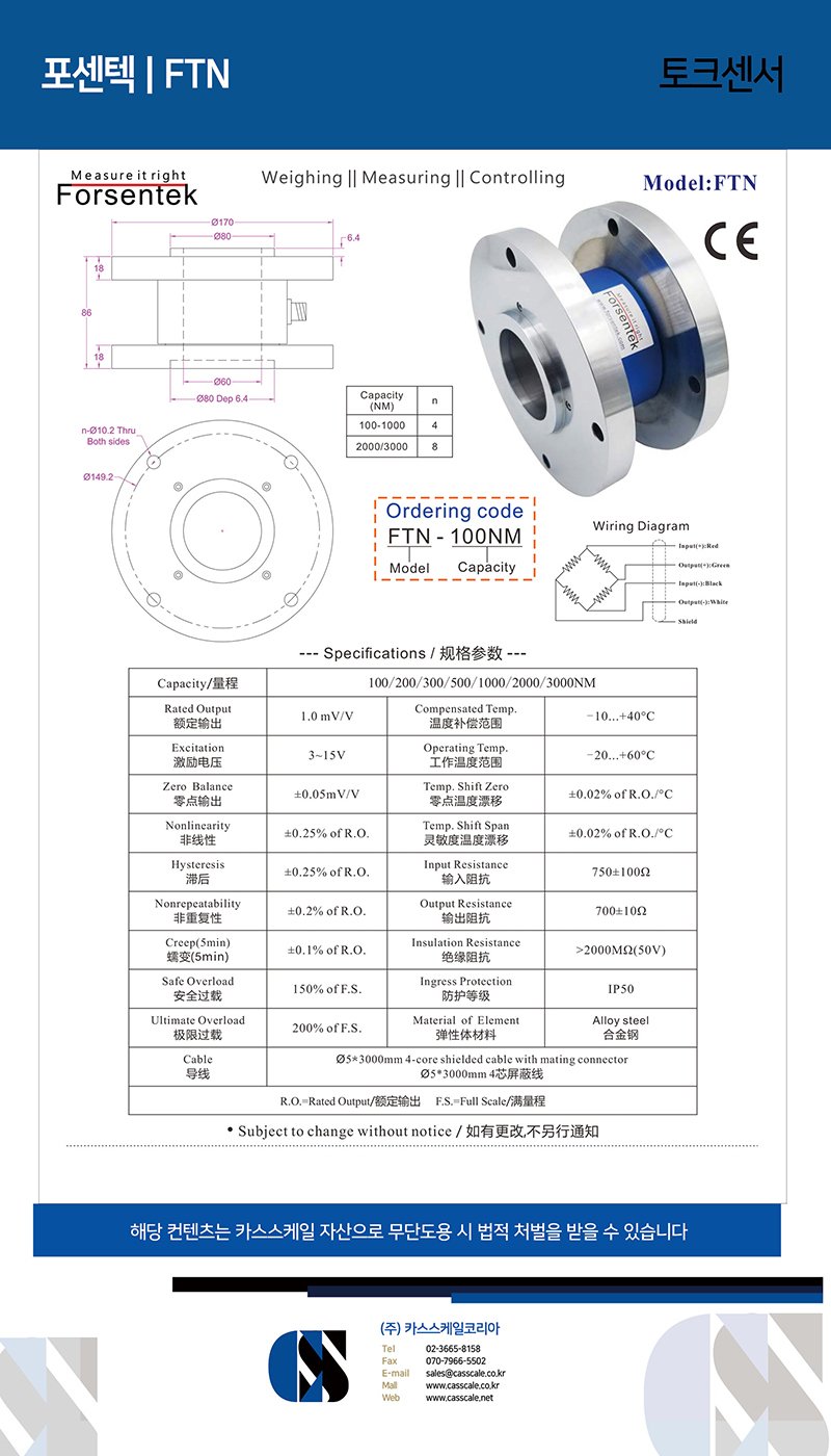 Low profile through hole torque transducer FTN is made of alloy steel based on strain gauge technology.A wheatstone full bridge is bonded on a special-machined elastic body to deliver mV/V output with maximum 0.25% non-linearity over a wide dynamic range.Reaction torque sensor FTN offers 0-100NM / 0-200NM / 0-300NM / 0-500NM / 0-1000NM / 0-2000NM / 0-3000NM seven measuring ranges to choose from.Flange to flange mounting with a 60mm hole goes through the center of the transducer which makes FTN applicable for both non-rotating and rotating torque measurement. Typical applications for this type of torque meter are for example servo motor torque measurement, test bench applications, fatigue testing, tightening torque control, twist measurement, motor dynamometers, actuator test and so on.
