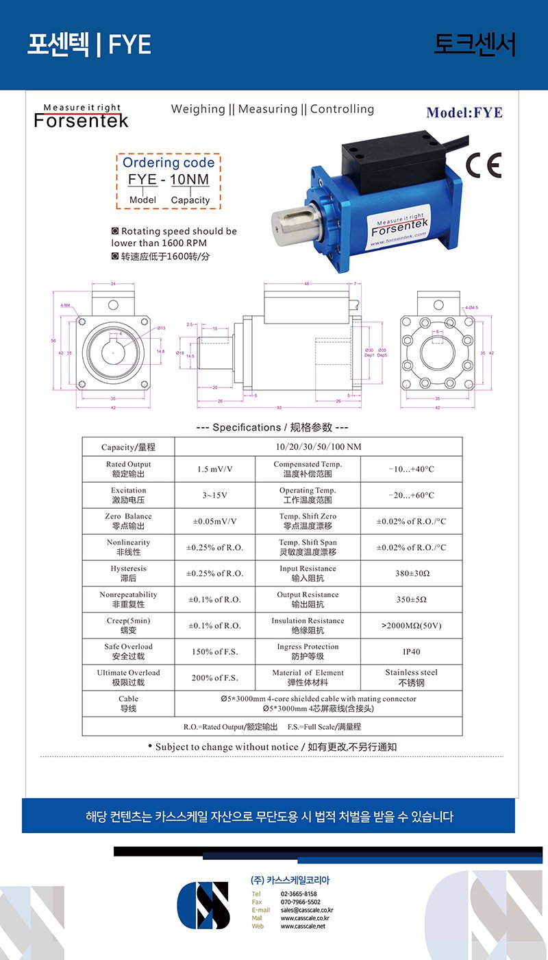 Rotary torque transducer FYE is a slip-ring type torque measuring unit intended for rotating torque measurement.Both mV/V signal and amplified 0-5V/0-10V/4-20mA output is available for model FYE.The inner keyed shaft end normally connects with servo motor shaft and works as input end,the outer keyed shaft end has the same specifications as motor shaft and works as output end,dimensions of both sides can be customized to meet the mounting requirements, which makes torque sensor FYE extremely suitable for torque measurement of servo motors with different specifications.