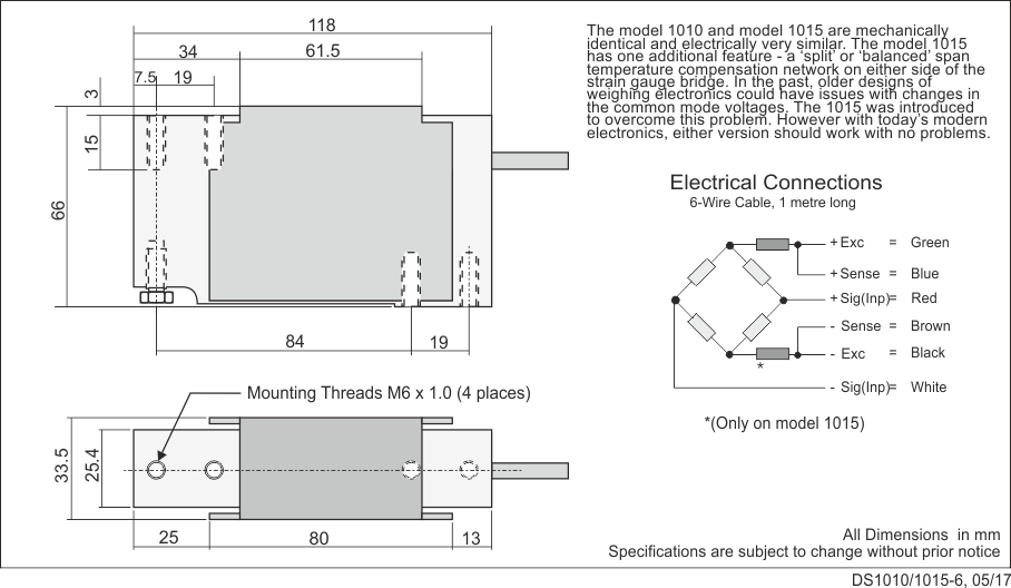The 1010/1015* load cell is fitted with a 6 core shielded cable as standard. Special cables and lengths are available on request.