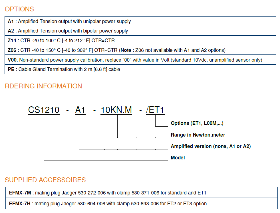 The CS1210 Series has been developed to measure torquein static applications. The mechanical design and gaugeplacement minimizes transverse effects.Fitted with metallic strain gauges in a Wheatstonebridge circuit, the CS1210 is providing excellenttemperature stability. For high-level output a model withintegrated amplifier is available.With a long standing experience as a designer andmanufacturer of sensors, TE CONNECTIVITY often workswith customers to design or customize sensors for specificuses and testing environments.On request, Instruction documents can be providedto ease the selection and use of our sensors and providehelpful tips.