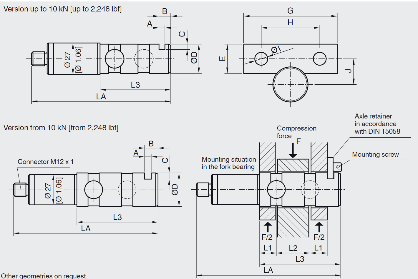 • Measuring ranges 0 … 5 kN to 0 … 200 kN [0 … 1,124 lbf to 0… 44,962 lbf]